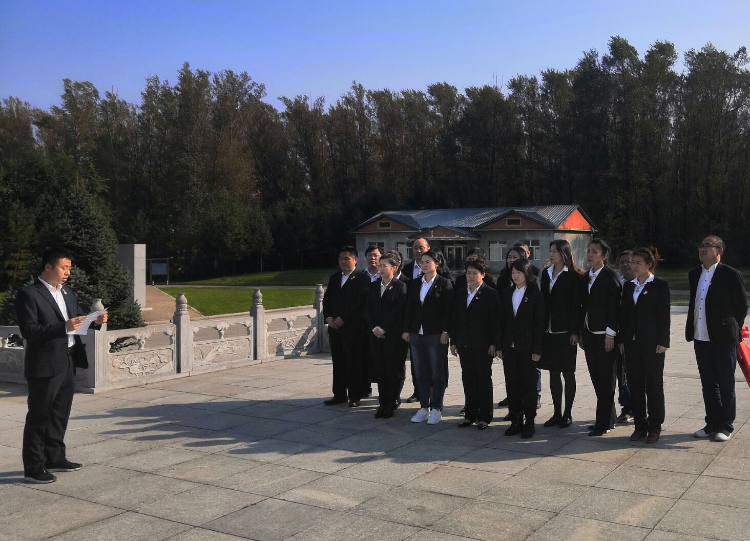 在英雄纪念碑前,教师裴伟代表全体党员做“继承先烈遗志,立德树人,兴业报国”主题发言,表示要继承先烈遗志,奋发有为。随后,教学支部书记卢凤伟带领全体党员重温入党誓词,全体党员向英雄纪念碑敬献鲜花,默哀表达对先烈的缅怀之情。最后,党员清扫了英雄纪念碑周围杂草和枯枝落叶。