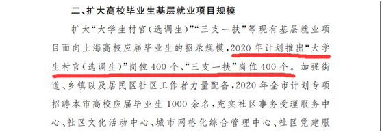 今年部分省市扩大大学生村官的招录规模。如上海市政府在《关于做好2020年上海高校毕业生就业工作若干意见的通知》中提出:将扩大基层就业项目招录规模,2020年计划推出“大学生村官(选调生)”岗位400个。以加强街道、乡镇以及居民区社区工作者力量配备。