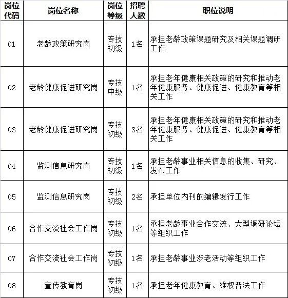 【岗位代码02】老龄健康促进研究岗1名专技中级